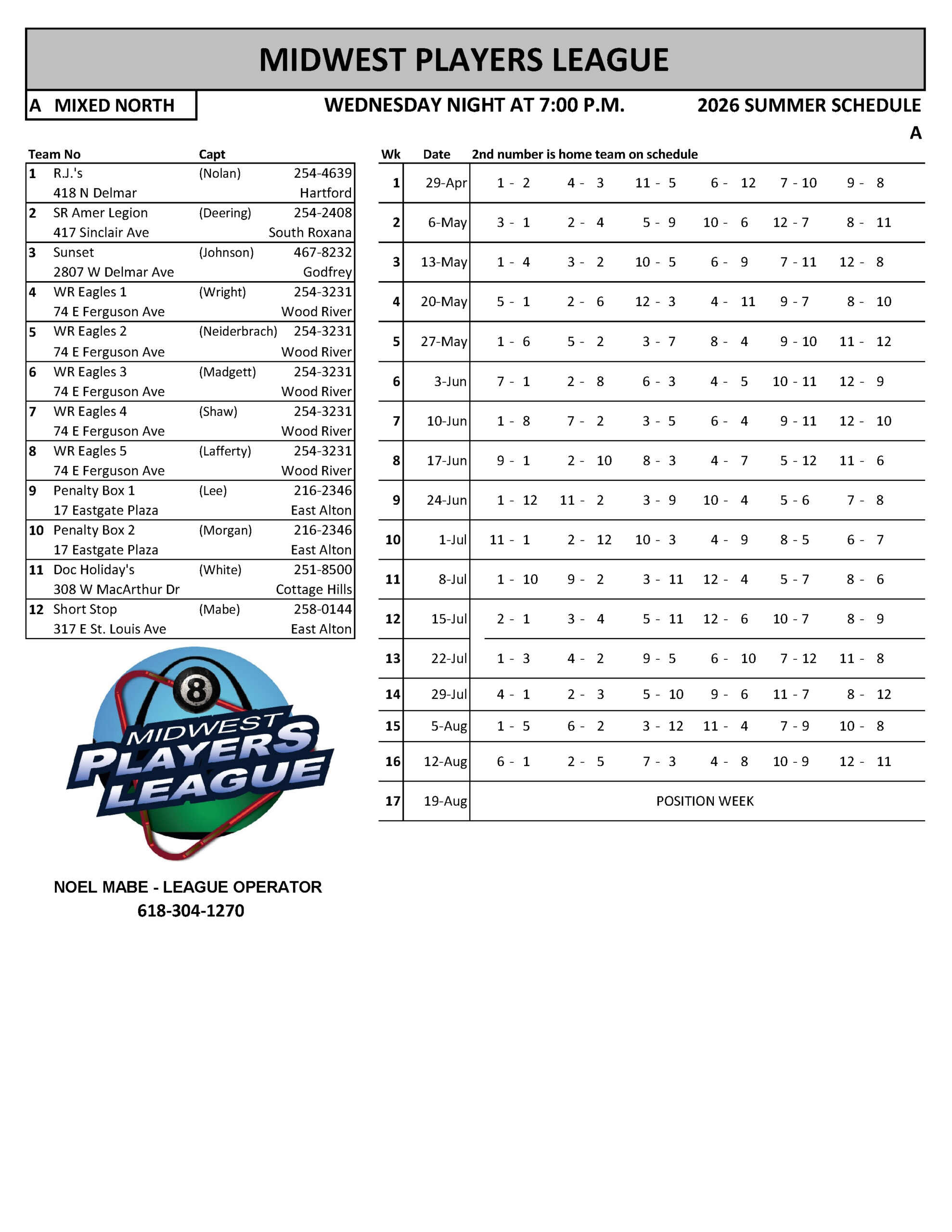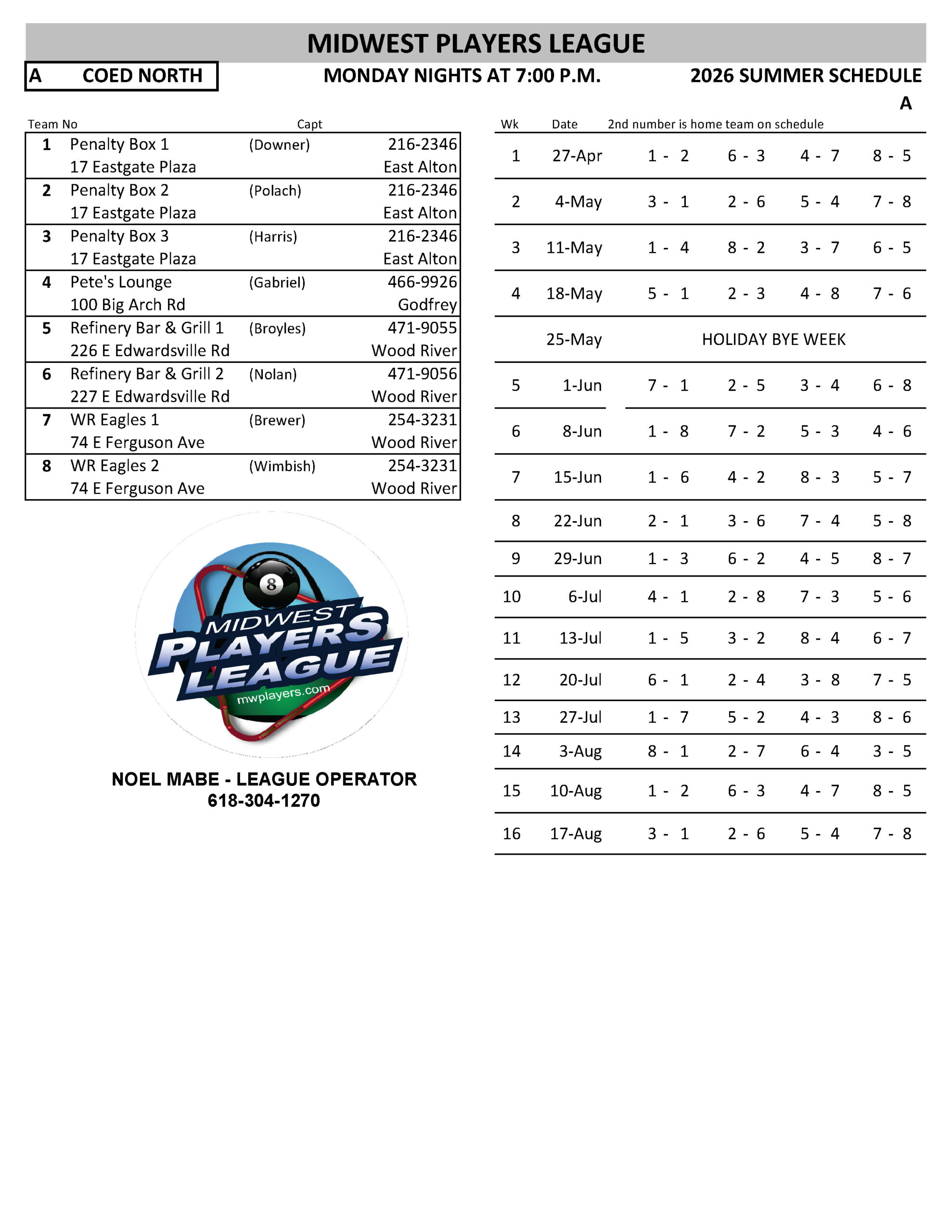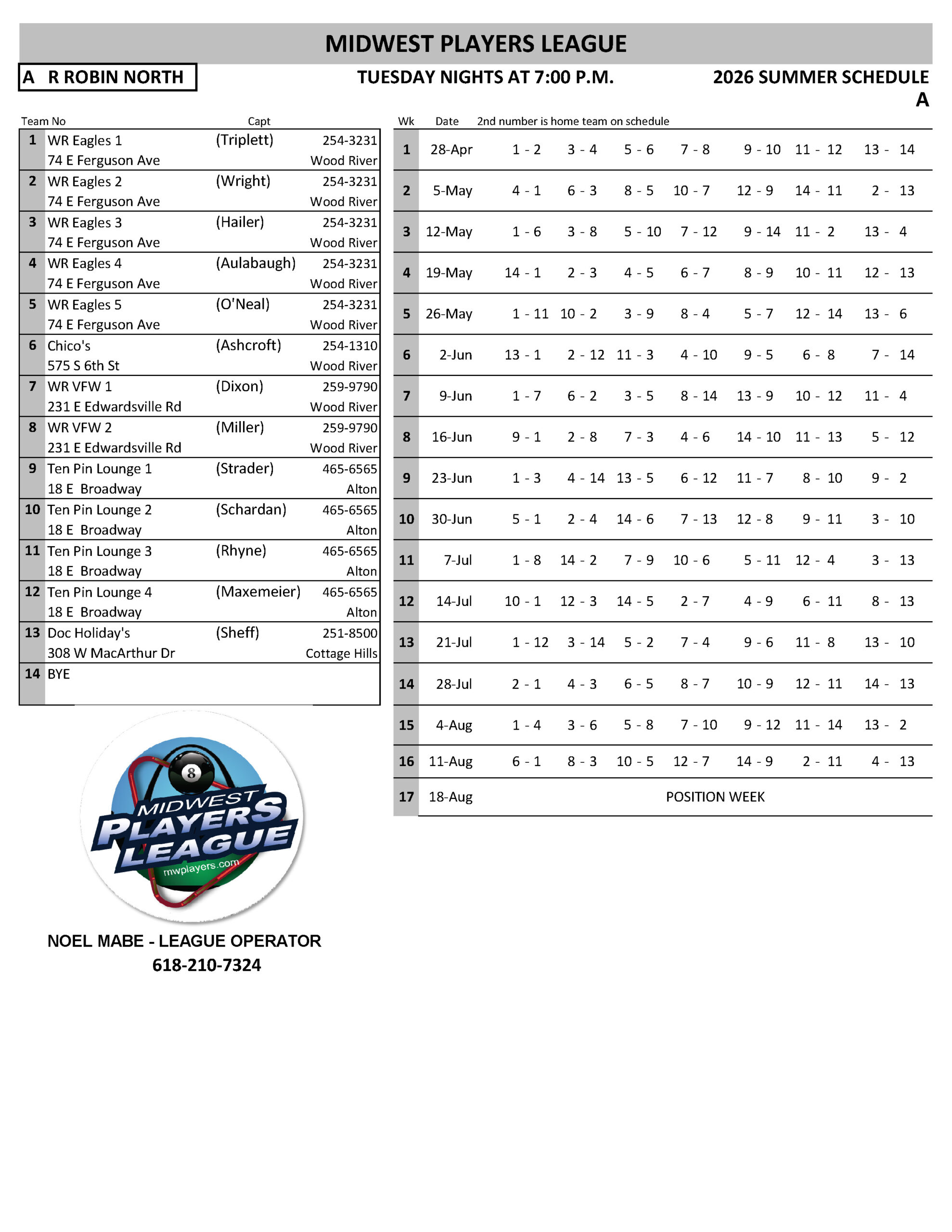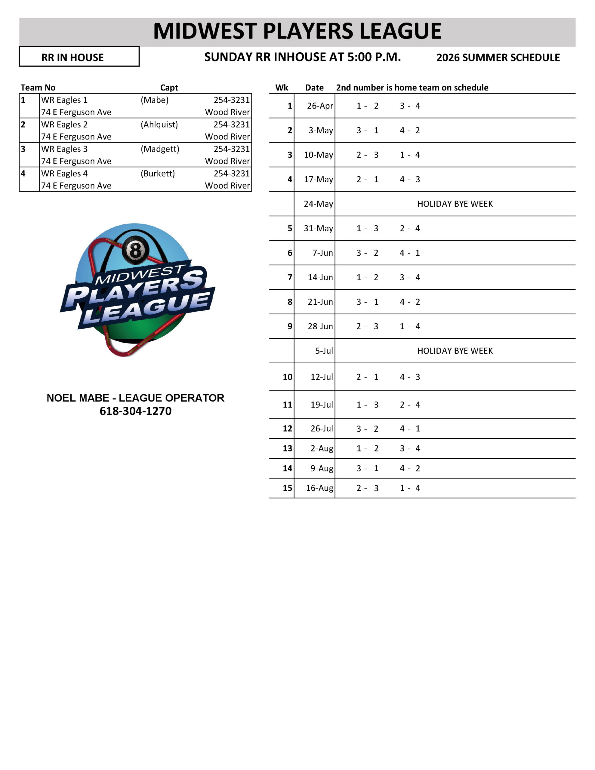 SCHEDULES 2026 SUMMER LEAGUE SUNDAY RR INHOUSE - WR EAGLES MONDAY MEN'S SOUTH - A MONDAY MEN'S SOUTH - B MONDAY MEN'S SOUTH - C MONDAY MEN'S SOUTH - D MONDAY COED NORTH TUESDAY RR NORTH TUESDAY WOMEN'S - A TUESDAY WOMEN'S - B WEDNESDAY COED SOUTH - A WEDNESDAY COED SOUTH - B WEDNESDAY COED SOUTH - C WEDNESDAY COED SOUTH - D WEDNESDAY MIXED NORTH - A