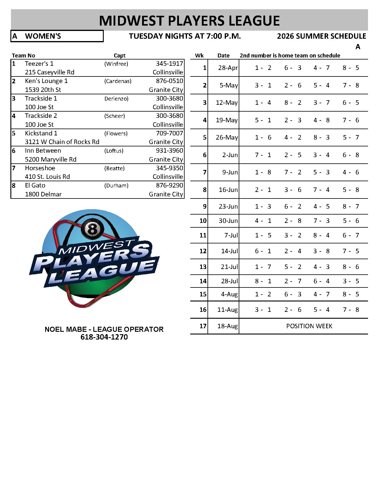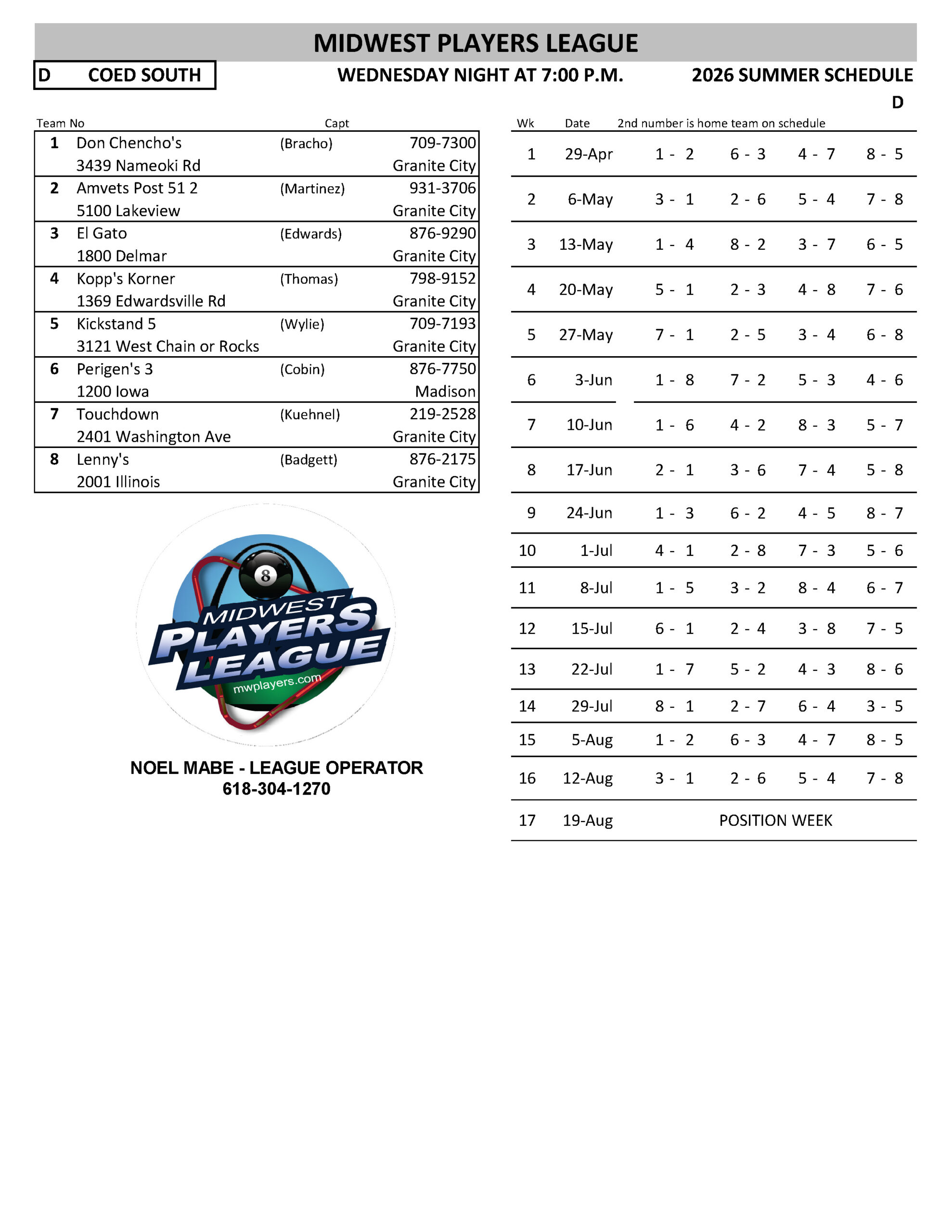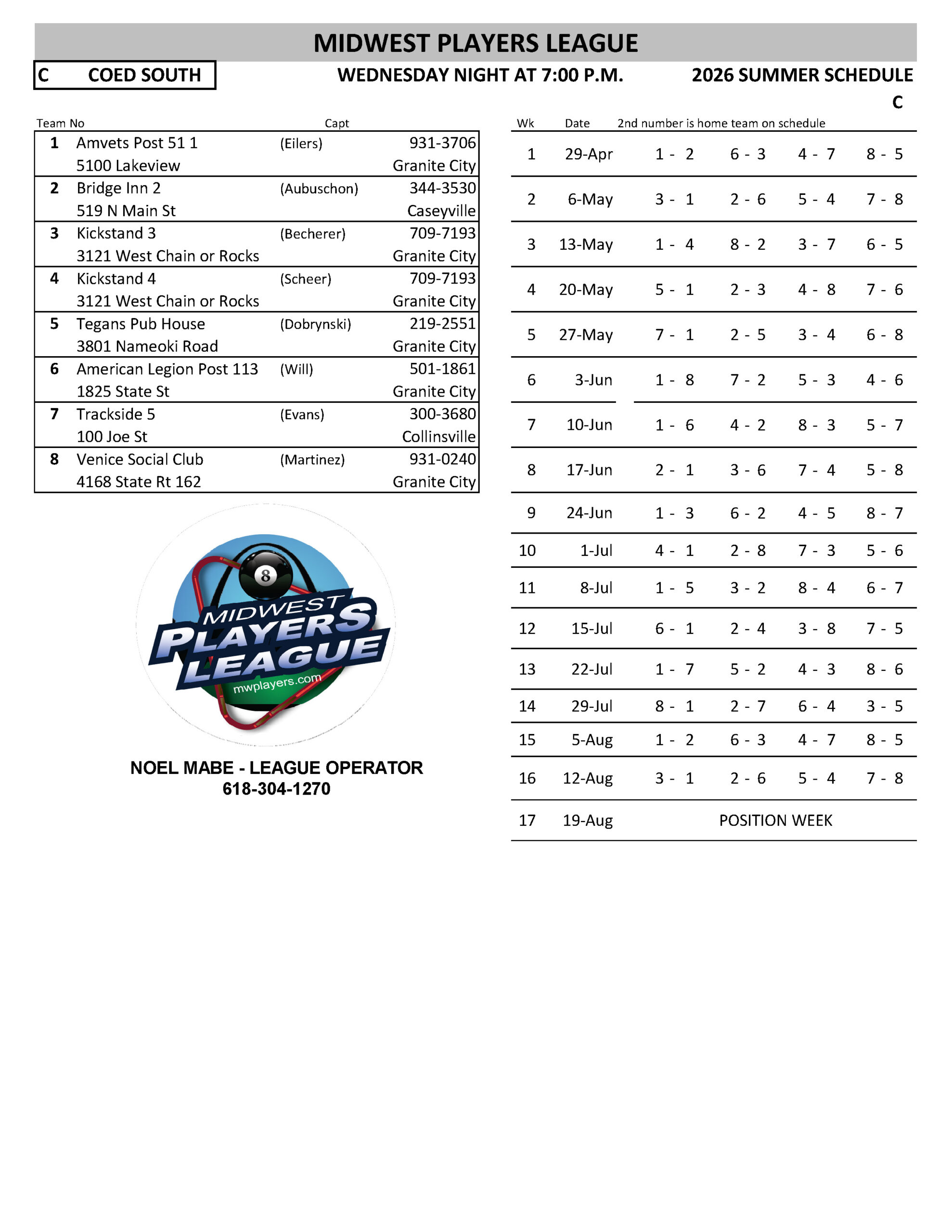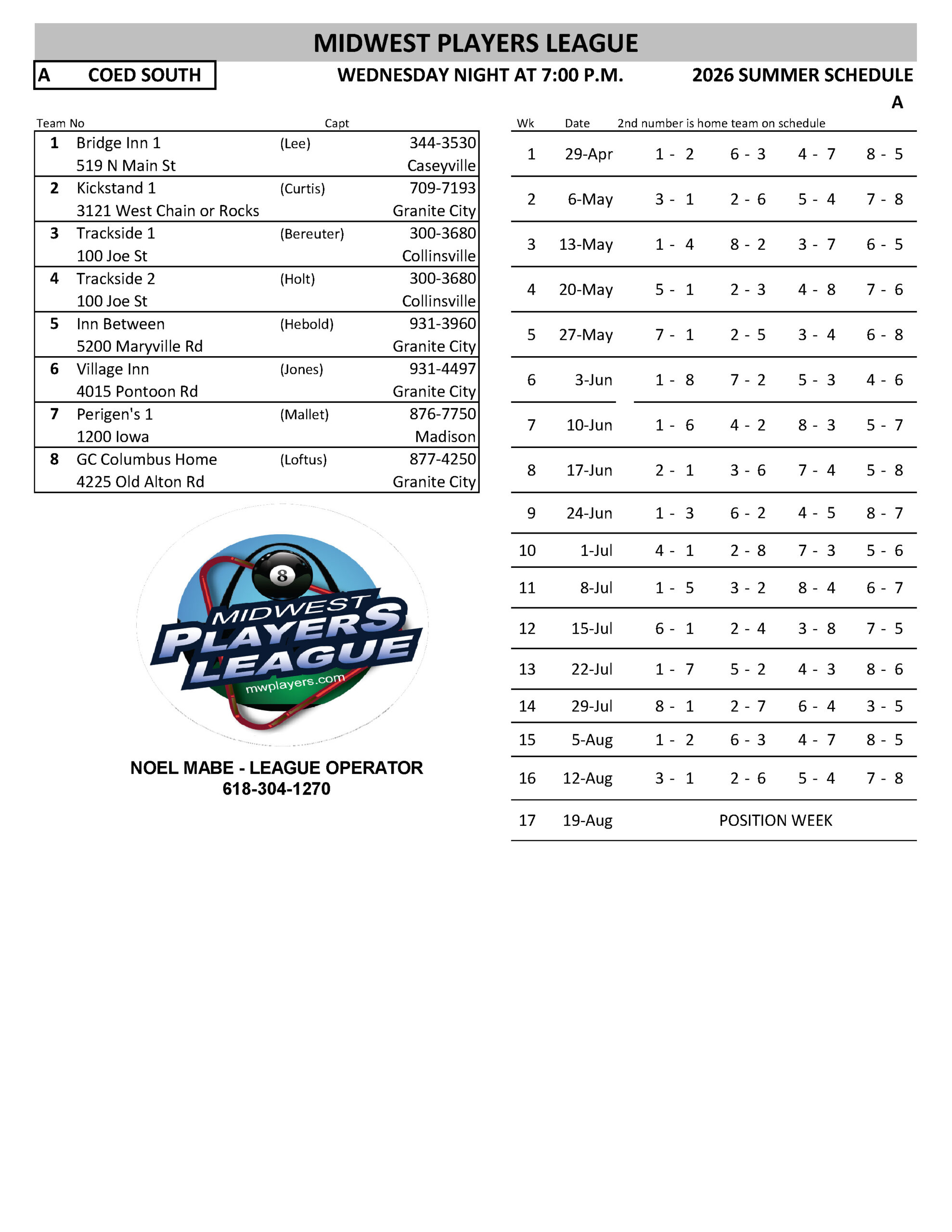 SCHEDULES 2026 SUMMER LEAGUE SUNDAY RR INHOUSE - WR EAGLES MONDAY MEN'S SOUTH - A MONDAY MEN'S SOUTH - B MONDAY MEN'S SOUTH - C MONDAY MEN'S SOUTH - D MONDAY COED NORTH TUESDAY RR NORTH TUESDAY WOMEN'S - A TUESDAY WOMEN'S - B WEDNESDAY COED SOUTH - A WEDNESDAY COED SOUTH - B WEDNESDAY COED SOUTH - C WEDNESDAY COED SOUTH - D WEDNESDAY MIXED NORTH - A