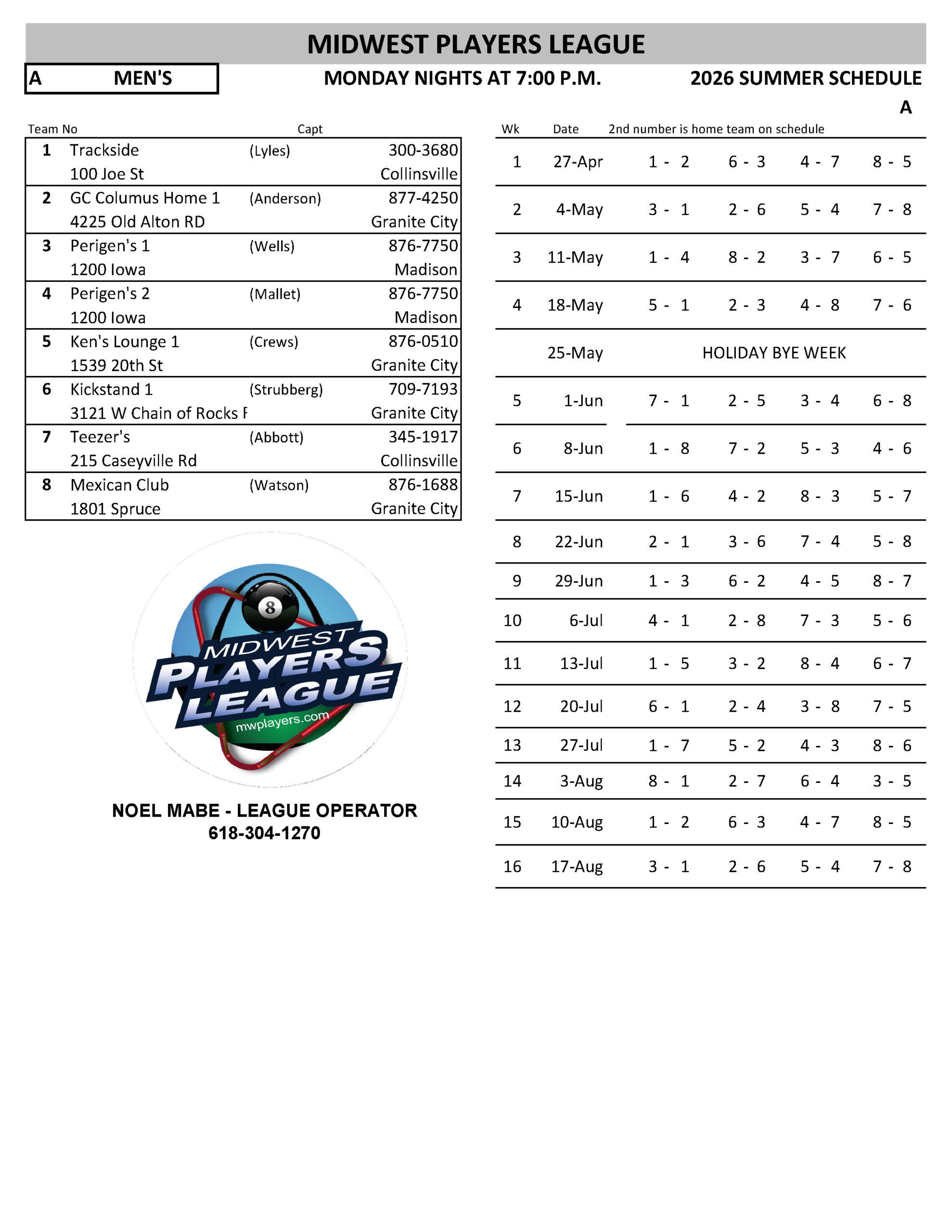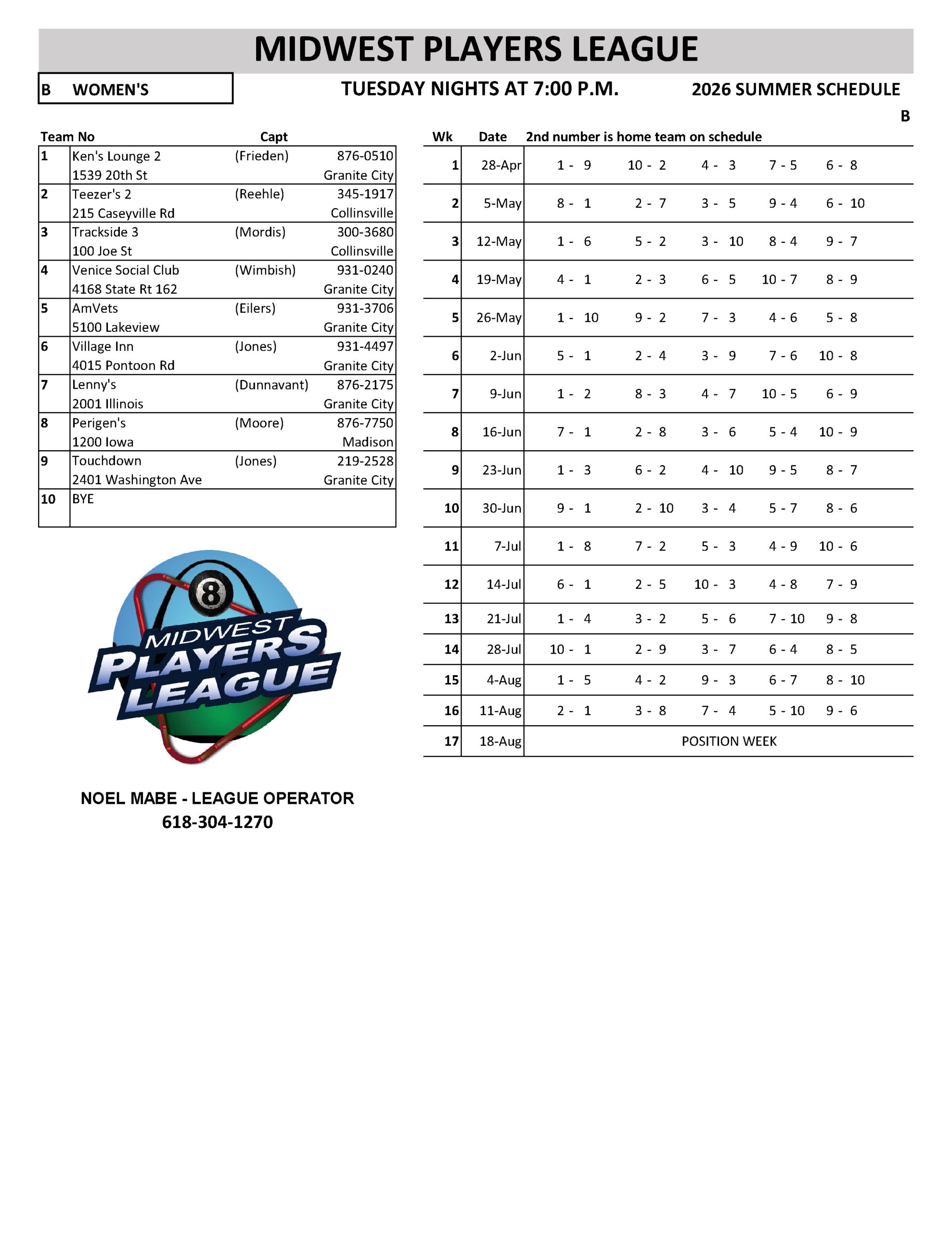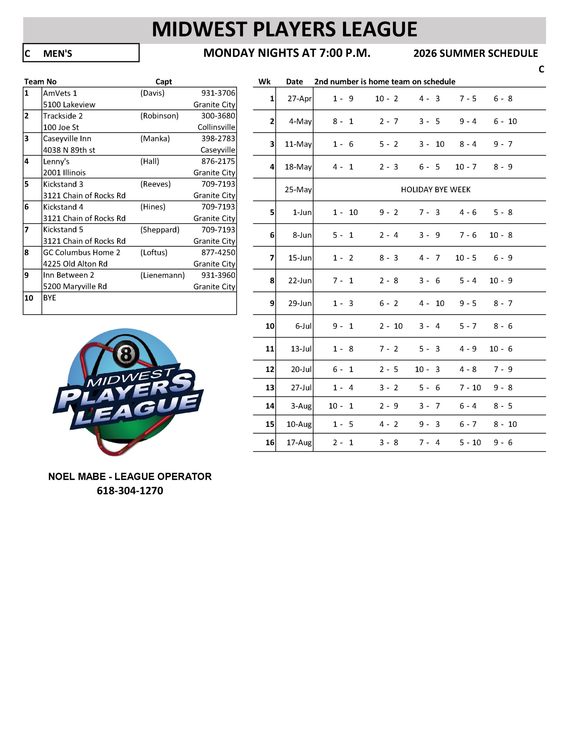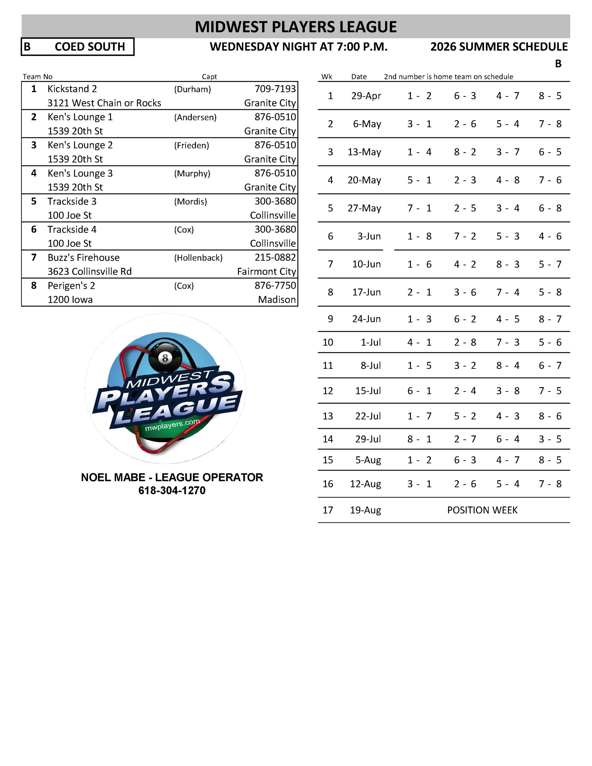 SCHEDULES 2026 SUMMER LEAGUE SUNDAY RR INHOUSE - WR EAGLES MONDAY MEN'S SOUTH - A MONDAY MEN'S SOUTH - B MONDAY MEN'S SOUTH - C MONDAY MEN'S SOUTH - D MONDAY COED NORTH TUESDAY RR NORTH TUESDAY WOMEN'S - A TUESDAY WOMEN'S - B WEDNESDAY COED SOUTH - A WEDNESDAY COED SOUTH - B WEDNESDAY COED SOUTH - C WEDNESDAY COED SOUTH - D WEDNESDAY MIXED NORTH - A